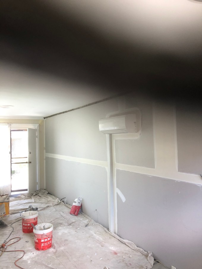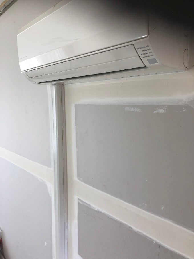 So in this example we used specialised plastering beads as you can see around heat pump, to still provide a quality finish for the client at a significantly reduced cost, as no electrician was needed to remove heat pump and re-install from wall.